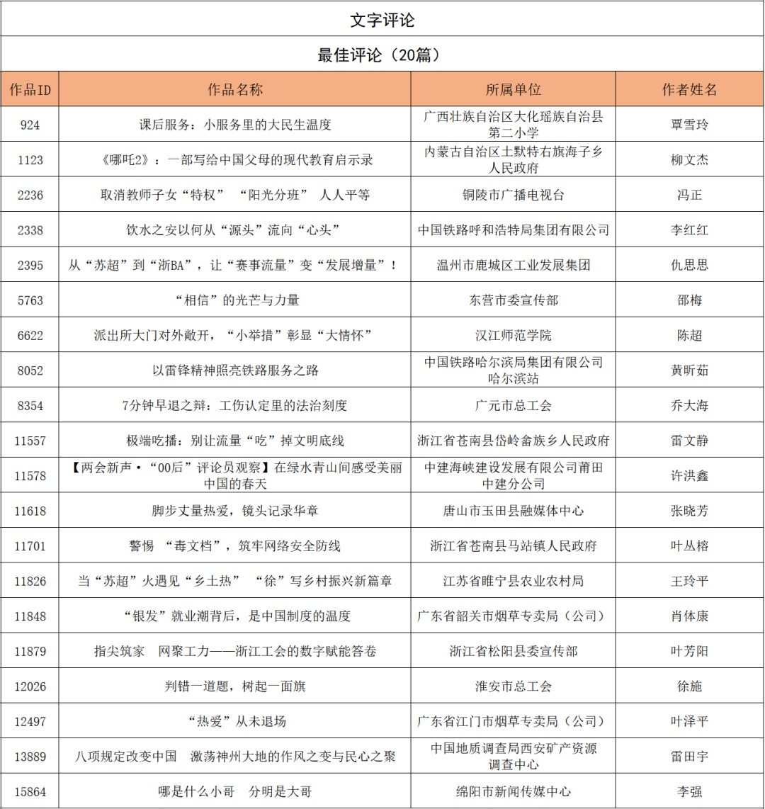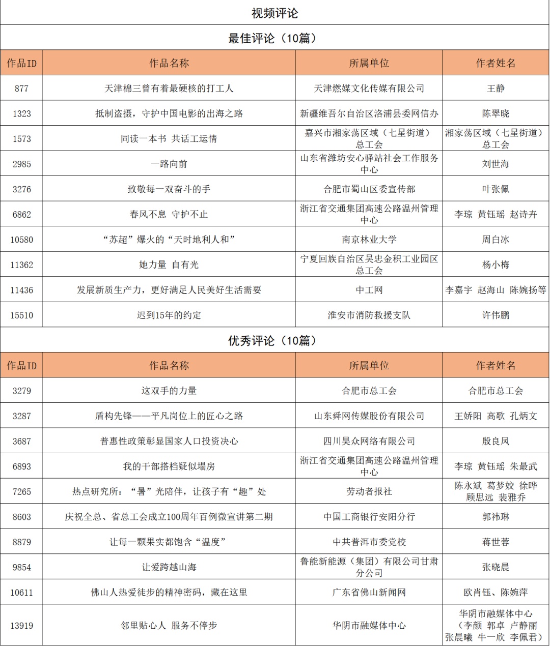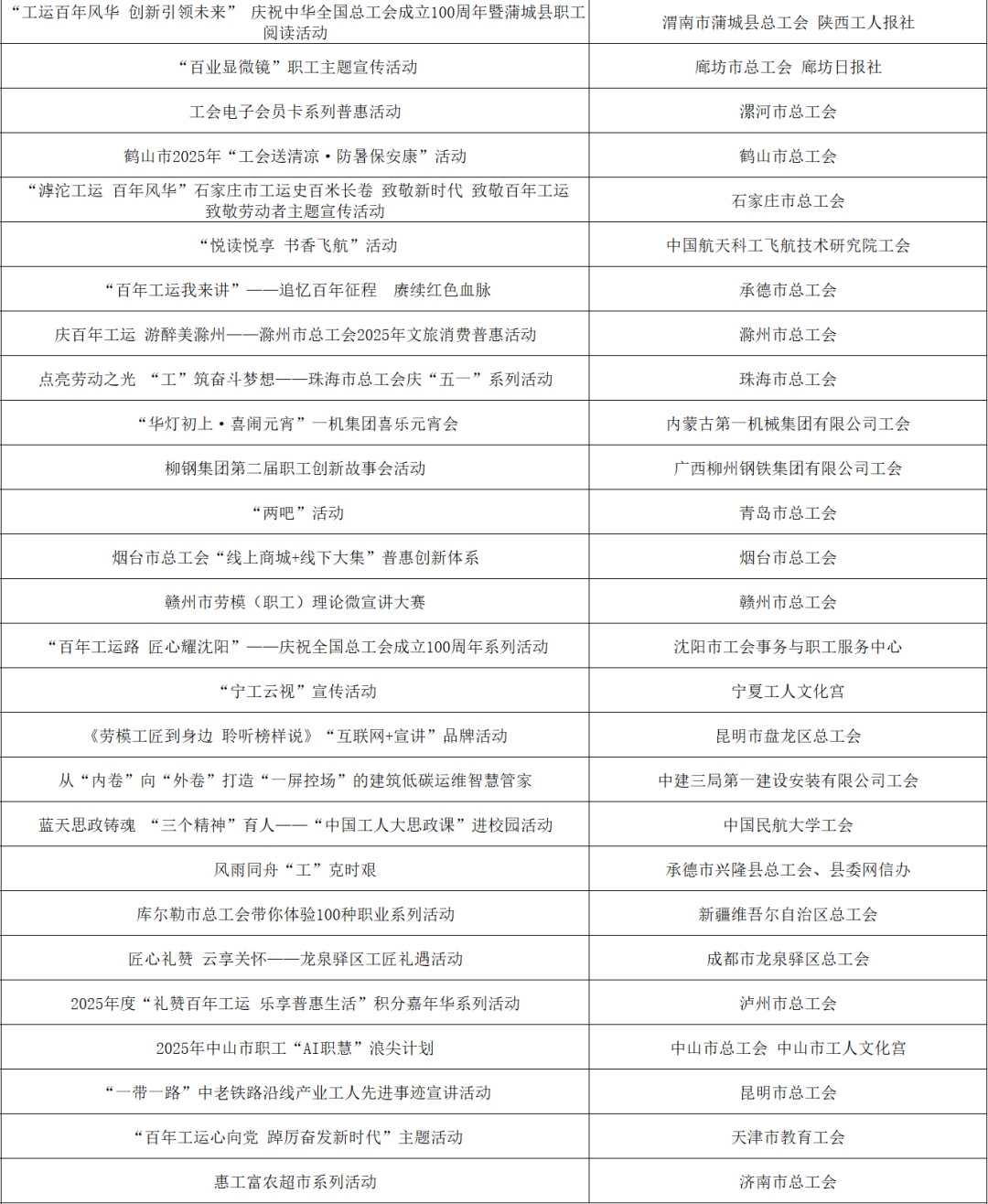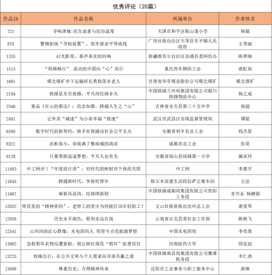 由中华全国总工会、中央网信办主办的2025年“网聚职工正能量 争做中国好网民”主题活动各子项目已完成网络投票和专家评审。最终得分由专家评审分数(占比60%)和网络投票分数(占比40%)相加构成。现将结果进行公示。公示期自2025年12月16日至2025年12月18日,为期3天。如无异议,12月下旬将公布最终结果。